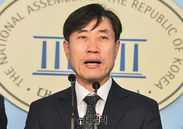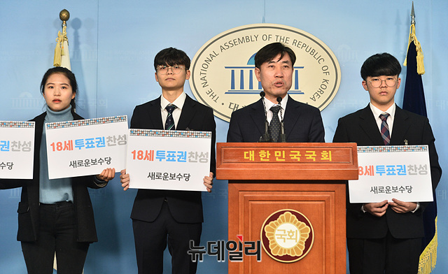 하태경 새로운보수당 창당준비위원장이 27일 오전 국회 정론관에서 기자회견을 갖고 선거법 처리를 위한 여야합의 타협안을 제안하고 있다. 이날 하 위원장은 "연동형 비례제는 폐기하고 만 18세 투표권은 통과시켜야 한다"고 말했다.
