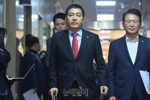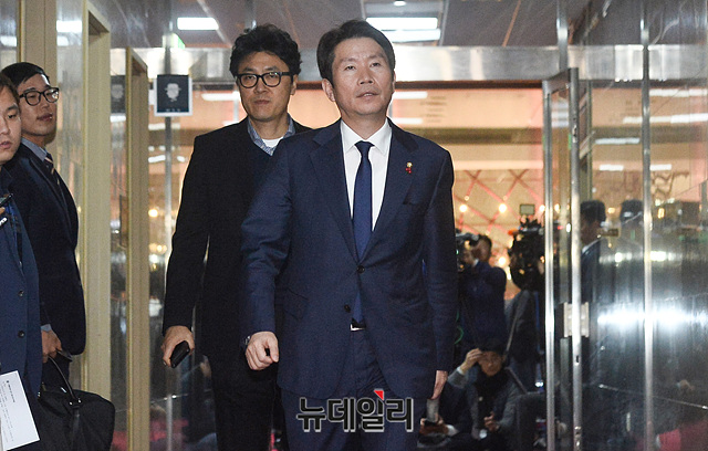 오신환 바른미래당 원내대표(왼쪽부터), 심재철 자유한국당 원내대표, 이인영 더불어민주당 원내대표가 27일 오전 문희상 국회의장 주재 3당 원내대표 회동을 위해 의장실에 입장하고 있다.