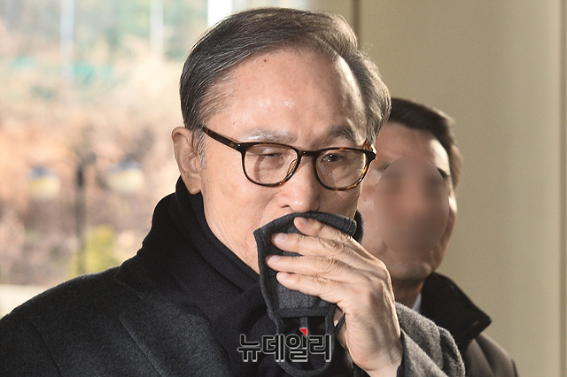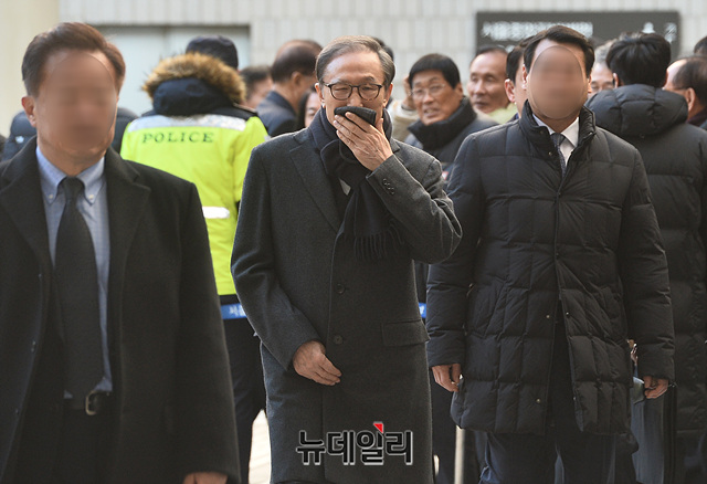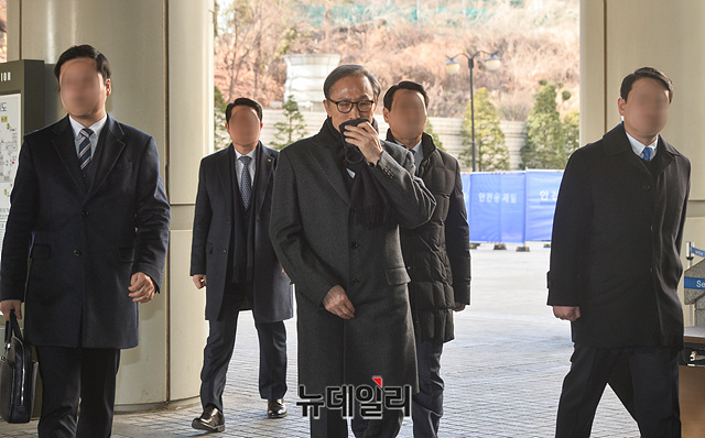 이명박 전 대통령이 27일 오후 서울 서초구 서울고등법원에서 열린 항소심 속행 공판에 출석하기 위해 법정으로 향하고 있다.