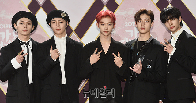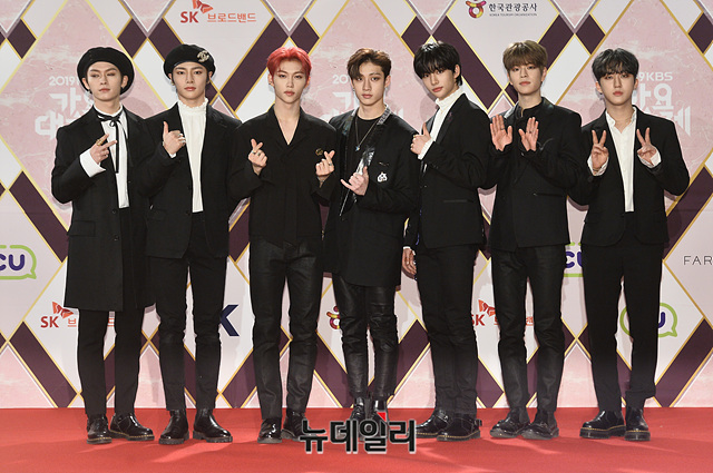 아이돌그룹 '스트레이키즈(Stray Kids)'가 27일 오후 경기 고양시 킨텍스에서 열린 '2019 KBS 가요대축제' 레드카펫 행사에서 포토타임을 갖고 있다.