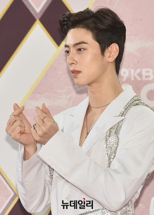 '아스트로(ASTRO)' 차은우가 27일 오후 경기 고양시 킨텍스에서 열린 '2019 KBS 가요대축제' 레드카펫 행사에서 포토타임을 갖고 있다.