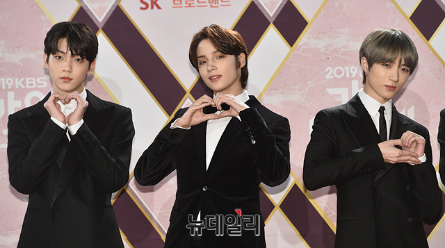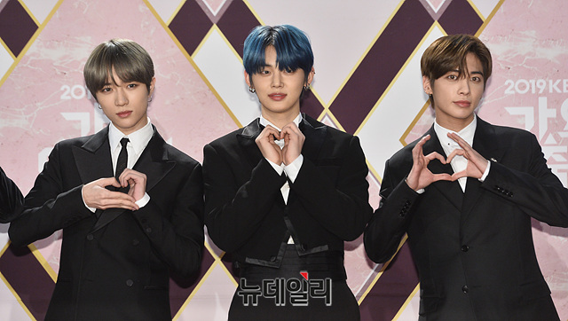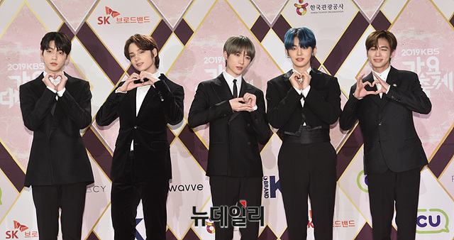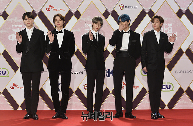 아이돌그룹 '투모로우바이투게더(TOMORROW X TOGETHER)'가 27일 오후 경기 고양시 킨텍스에서 열린 '2019 KBS 가요대축제' 레드카펫 행사에서 포토타임을 갖고 있다.