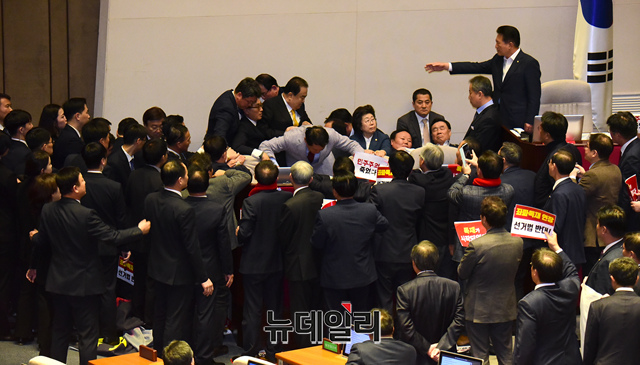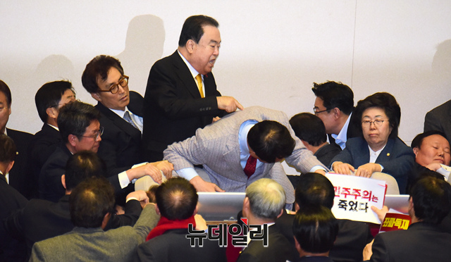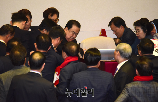 [포토] 단상으로 밀고 올라가는 문희상 의장