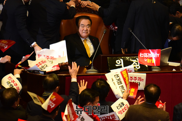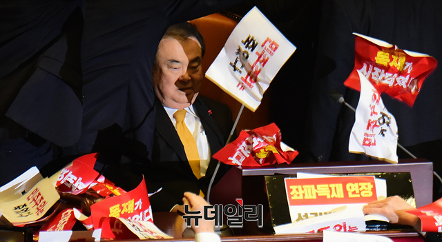 [포토] 文 의장 향해 피켓 뿌리는 자유한국당