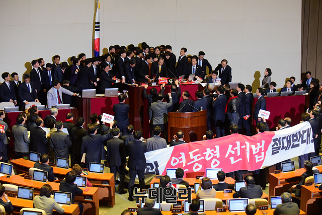 자유한국당 의원들이 27일 오후 국회 본회의장에서 선거법 일부 개정안을 강행 처리한 문희상 국회의장에게 항의하고 있다.