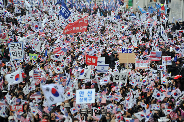 '문재인 퇴진'을 촉구하며 국민대회에 참가한 시민들이 28일 오후 서울 광화문 광장에서 열린 국민대회에서 태극기와 성조기 등을 흔들고 있다.