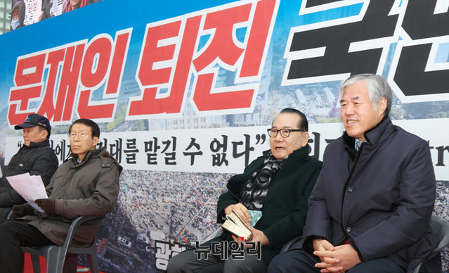전광훈 한국기독교총연합회 대표회장이 28일 오후 서울 광화문 광장에서 열린 '문재인 퇴진' 국민대회에 참석해 자리하고 있다.