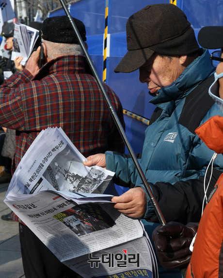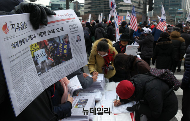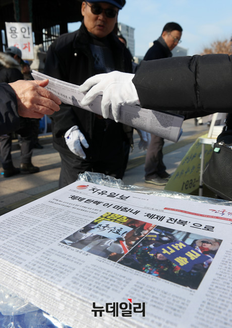 문재인하야범국민투쟁본부 소속 관계자들이 28일 오후 서울 광화문 광장에서 주최 측이 발행한 '자유 일보'를 시민들에게 나눠주고 있다. 주최측은 기성언론에서 공정한 보도를 기대할 수 없어 '자유일보'를 발행했다며 시민들에게 구독을 권유했다.