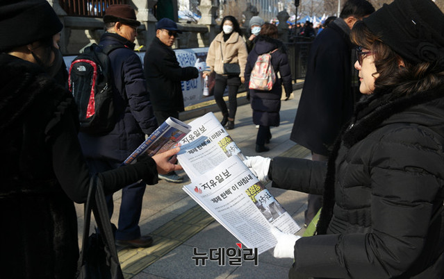 [포토] '자유 일보' 구독 권유하는 집회 참가자들