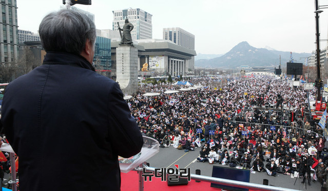 전광훈 한국기독교총연합회 대표회장이 28일 오후 서울 광화문 광장에서 열린 '문재인 퇴진' 국민대회에서 대회사를 하고 있다.
