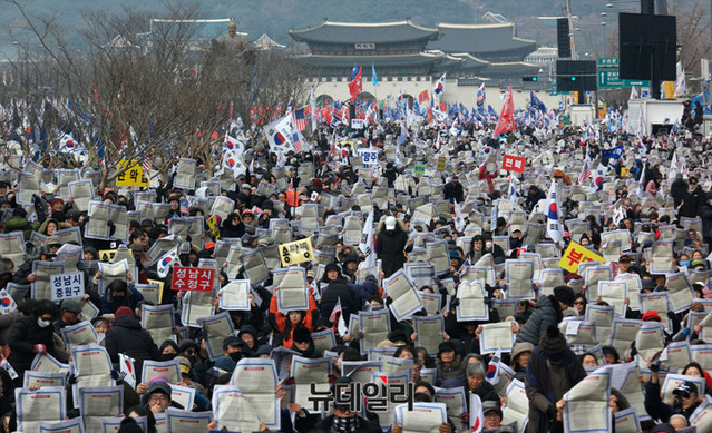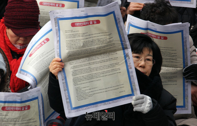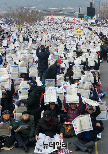 '문재인 퇴진'을 촉구하며 국민대회에 참가한 시민들이 28일 오후 서울 광화문 광장에서 열린 국민대회에서 주최 측에서 발행하는 '자유일보'를 들고 있다. 주최측은 기성언론에서 공정한 보도를 기대할 수 없어 '자유일보'를 발행했다며 시민들에게 구독을 권유했다.