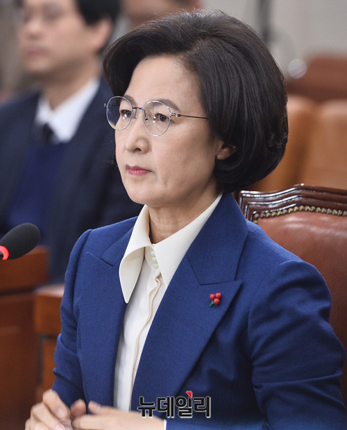 추미애 법무부 장관 후보자가 30일 오전 국회 법제사법위원회에서 열린 인사청문회에서 안경을 착용하고 있다.