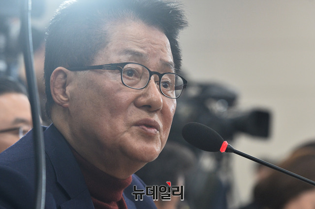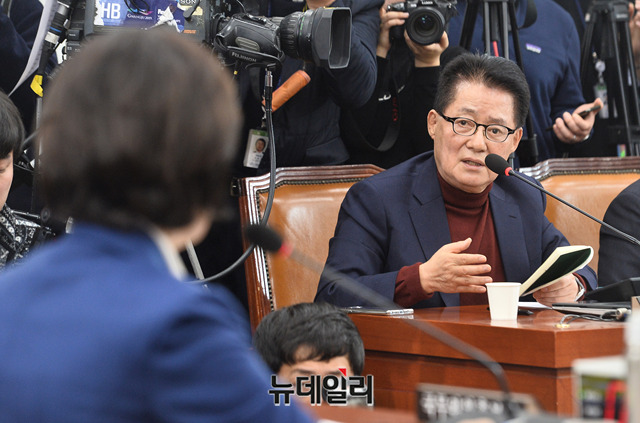 박지원 의원이 30일 오전 국회 법제사법위원회에서 열린 추미애 법무부 장관 후보자 인사청문회에서 추 후보자에게 질의를 하고 있다.