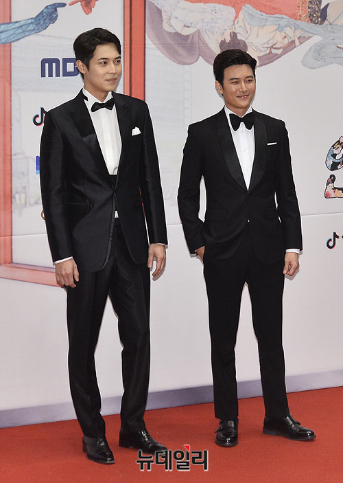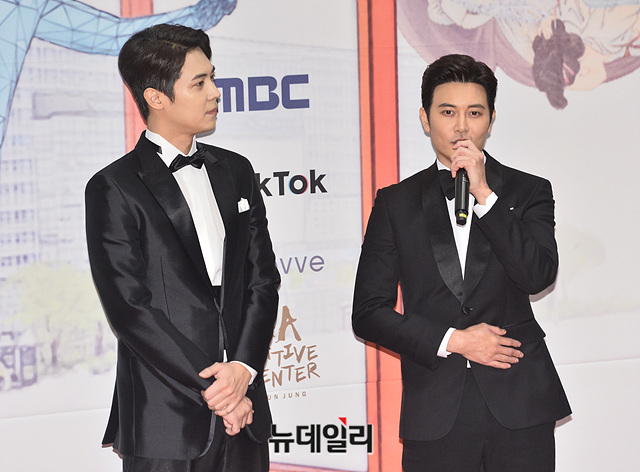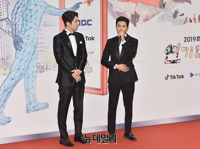 배우 재희(왼쪽), 김형민이 30일 오후 서울 마포구 MBC에서 열린 '2019 MBC 연기대상' 레드카펫 행사에서 소감을 말하고 있다.