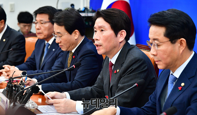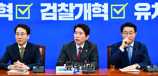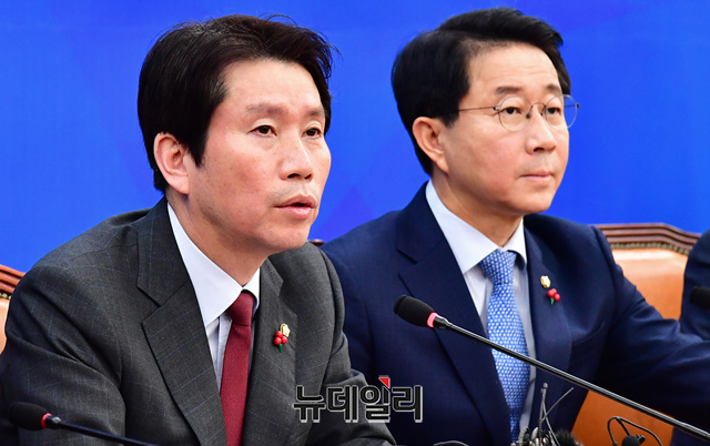 이인영 더불어민주당 원내대표가 31일 오전 국회에서 열린 원내대책회의에서 모두발언을 하고 있다