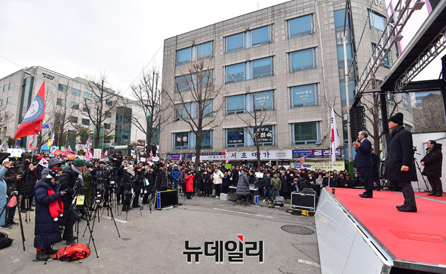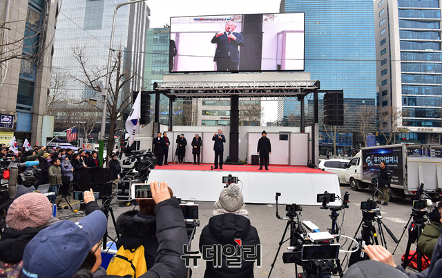 전광훈 한기총 대표회장이 2일 오전 서울 서초구 서울중앙지법에서 영장실질심사를 앞두고 법원입구에서 열린 집회 연단에 올라 발언하고 있다.