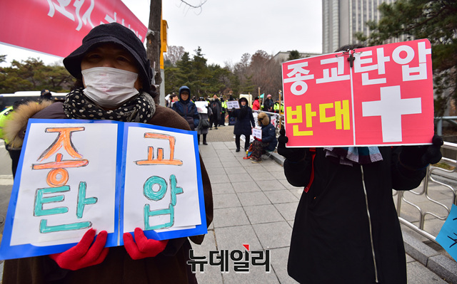 전 대표회장의 구속을 반대하며 열린 집회는 '종교탄압' 등의 손피켓을 든 지지자들이 대거 몰렸다.