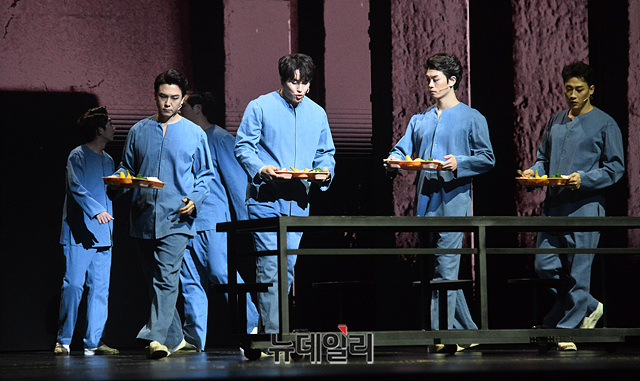 뮤지컬배우 민우혁이 2일 오후 서울 서초구 한전아트센터에서 열린 뮤지컬 '영웅본색' 프레스콜에서 하이라이트 장면을 시연하고 있다.