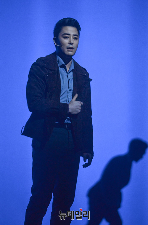 뮤지컬배우 한지상이 2일 오후 서울 서초구 한전아트센터에서 열린 뮤지컬 '영웅본색' 프레스콜에서 하이라이트 장면을 시연하고 있다.