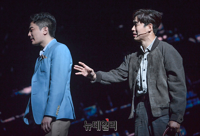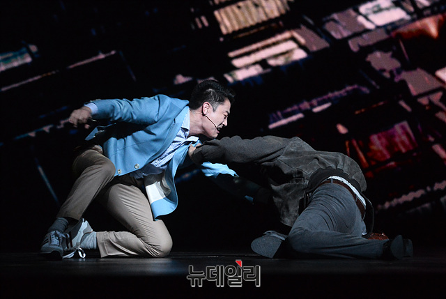 뮤지컬배우 한지상, 유준상이 2일 오후 서울 서초구 한전아트센터에서 열린 뮤지컬 '영웅본색' 프레스콜에서 하이라이트 장면을 시연하고 있다.