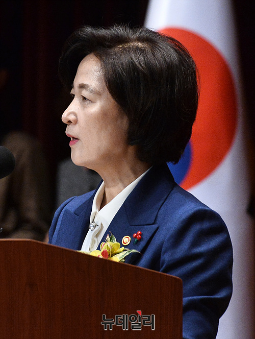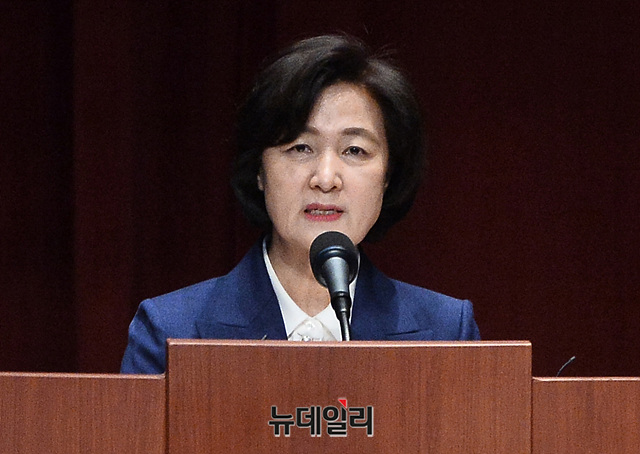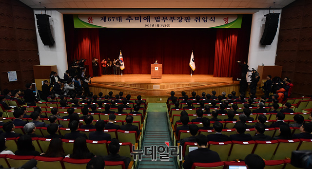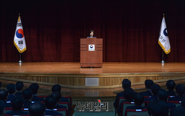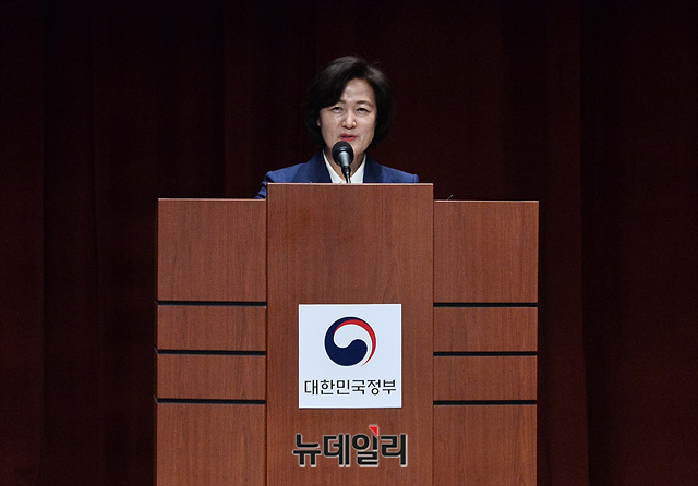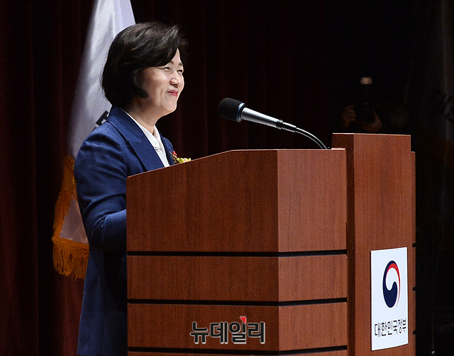 추미애 신임 법무부 장관이 3일 오전 경기 과천시 정부과천청사에서 열린 취임식에서 취임사를 하고 있다.