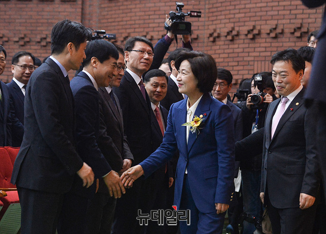[포토] 취임식 후 직원들과 인사나누는 추미애