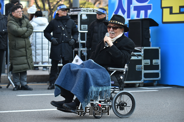 올해 93세를 맞이한 김동길 연세대 명예교수는 휠체어를 타고 광화문 집회에 참석했다. 김동길 명예교수는 자유한국당을 비롯한 우파진영의 분열과 갈등을 비판하면서 “우리는 대한민국을 위해 살다가 대한민국을 위해 죽자”고 외쳤다.