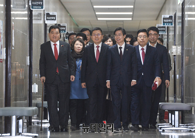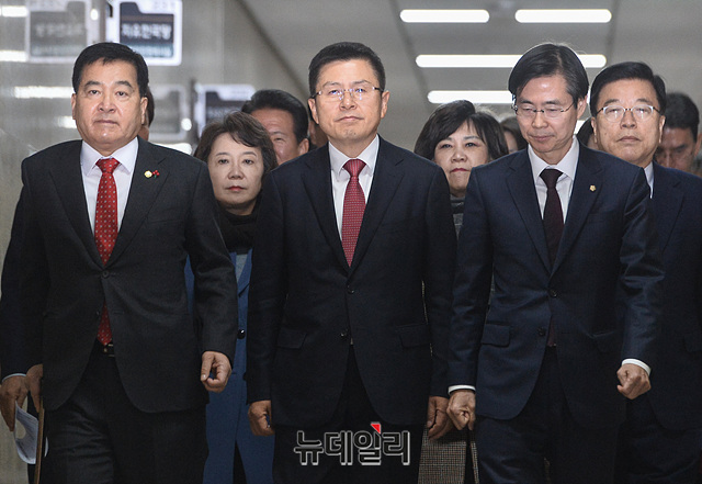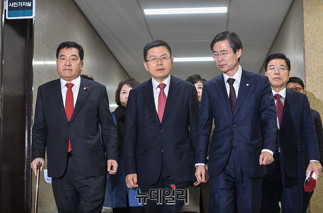 황교안 자유한국당 대표, 심재철 원내대표, 조경태 최고위원 등 지도부가 6일 오전 국회에서 열린 최고위원회의에 입장하고 있다.