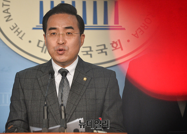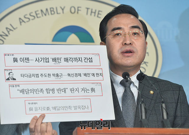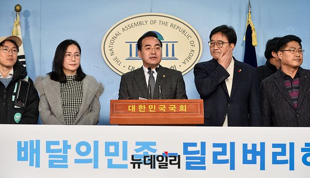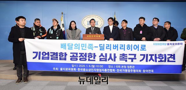 박홍근 더불어민주당 을지로위원회 위원장, 우원식·제윤경 을지로위원회 의원, 한국중소상인자영업자총연합회, 전국가맹점주협의회, 참여연대 등이 6일 오전 국회 정론관에서 '배달의민족-딜리버리히어로 기업결합 심사 관련 기자회견'을 갖고 있다.