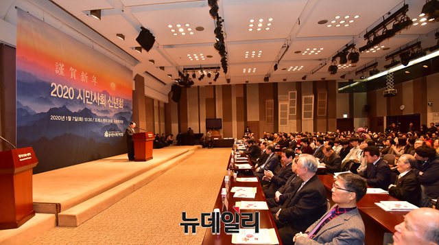 이갑산 범시민사회단체연합 상임대표가 7일 오전 서울 중구 한국프레스센터에서 열린 '2020 시민사회 신년회'에서 인사말을 하고 있다.