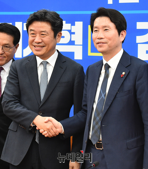 이인영 더불어민주당 원내대표가 8일 오후 국회 원내대표실에서 유의동 새로운보수당 원내대표를 접견하고 악수를 나누고 있다.