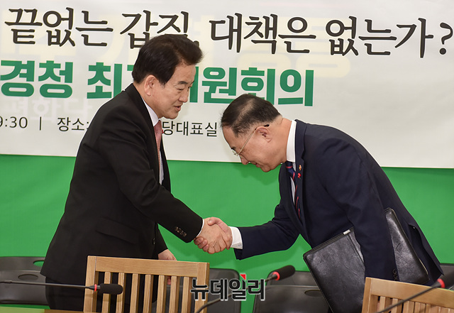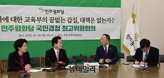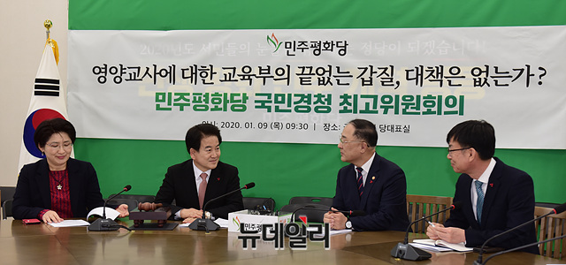 홍남기 경제부총리 겸 기획재정부 장관과 김상조 청와대 정책실장이 9일 오전 국회에서 정동영 민주평화당 대표를 만나 '이란 사태에 따른 한국경제 대응 방안' 관련 대화를 나누고 있다.