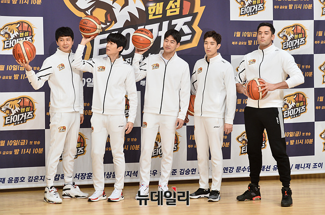 핸섬 타이거즈 맴버(왼쪽부터 김승현, 서지석, 이상윤, 강경준, 줄리엔 강)가 9일 오후 서울 양천구 SBS에서 열린 예능 '진짜 농구, 핸섬 타이거즈' 제작발표회에서 포토타임을 갖고 있다.