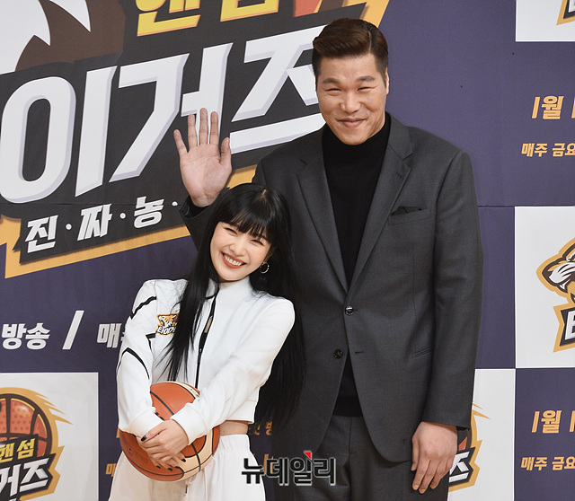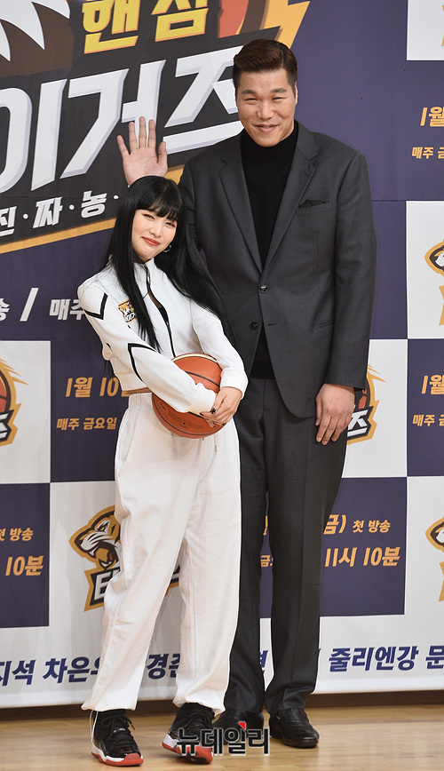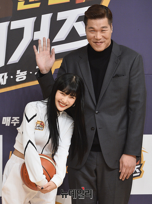 레드벨벳 맴버 조이(왼쪽), 방송인 서장훈이 9일 오후 서울 양천구 SBS에서 열린 예능 '진짜 농구, 핸섬 타이거즈' 제작발표회에서 포토타임을 갖고 있다.