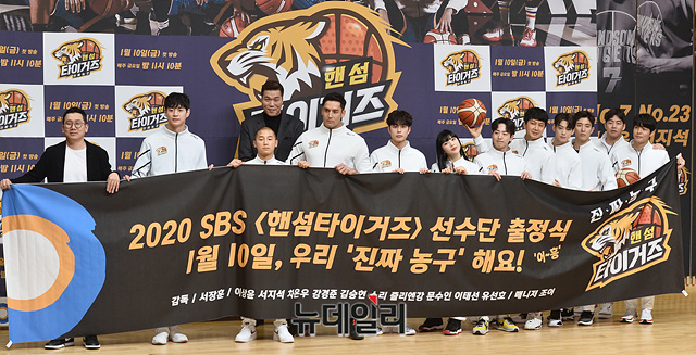 '진짜 농구, 핸섬 타이거즈' 출연진(서장훈, 조이, 김승현, 서지석, 이상윤, 강경준, 줄리엔 강, 유선호, 이태선, 쇼리, 차은우, 문수인, 안재철 PD)이 9일 오후 서울 양천구 SBS에서 열린 제작발표회에서 포토타임을 갖고 있다.