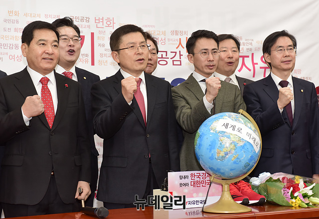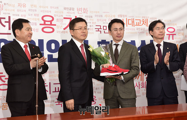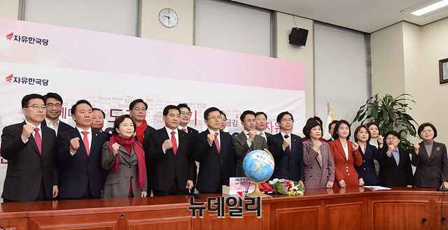 황교안 자유한국당 대표, 심재철 원내대표, 한국당 세번째 영입 인사인 극지탐험가 남영호 씨 등 의원들이 13일 오전 국회에서 열린 '2020년 영입인사 환영식'에서 기념촬영을 하고 있다.