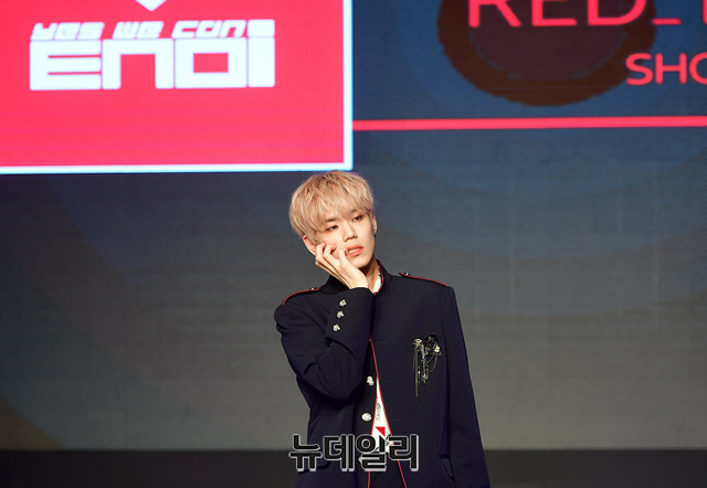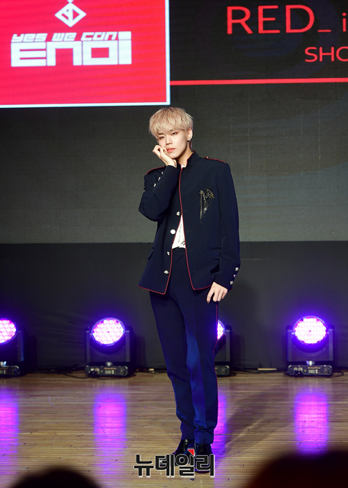 아이돌그룹 'ENOi(이엔오아이)' 리더 라온이 13일 오후 서울 강남구 일지아트홀에서 열린 첫번째 미니앨범 'Red in the Apple(레드 인 디 애플)' 쇼케이스에서 포토타임을 갖고 있다.