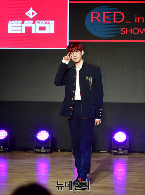 아이돌그룹 'ENOi(이엔오아이)' 멤버 하민이 13일 오후 서울 강남구 일지아트홀에서 열린 첫번째 미니앨범 'Red in the Apple(레드 인 디 애플)' 쇼케이스에서 포토타임을 갖고 있다.