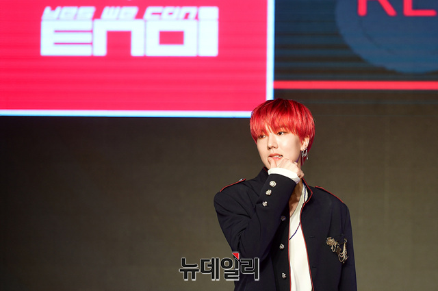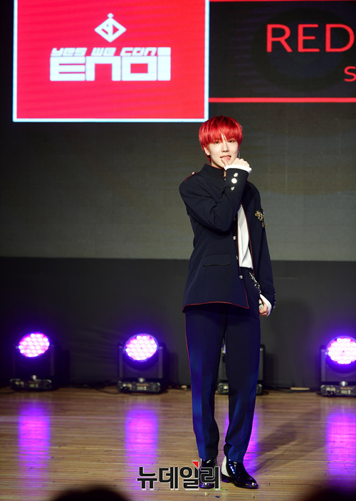 아이돌그룹 'ENOi(이엔오아이)' 멤버 제이키드가 13일 오후 서울 강남구 일지아트홀에서 열린 첫번째 미니앨범 'Red in the Apple(레드 인 디 애플)' 쇼케이스에서 포토타임을 갖고 있다.