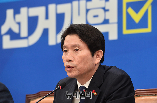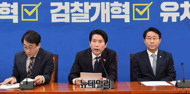 이인영 더불어민주당 원내대표가 14일 오전 국회에서 열린 원내대책회의에서 모두발언을 하고 있다.