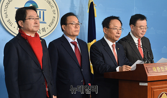 이주영 자유한국당 북한선원 강제북송 진상규명 TF 위원장, 백승주 의원, 이채익 의원, 강효상 의원이 14일 오전 국회 정론관에서 북한선원 강제북송 진상규명을 촉구하는 기자회견을 갖고 있다.