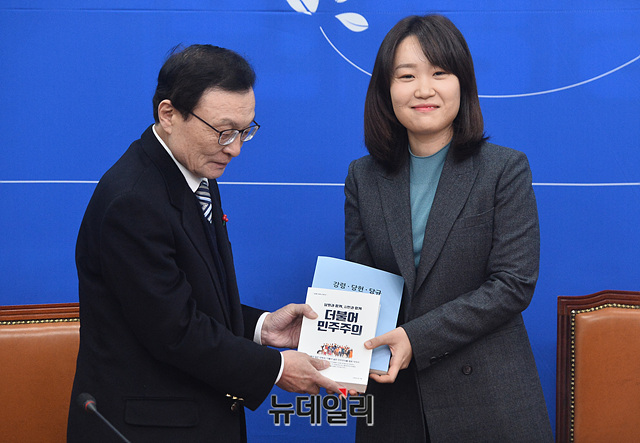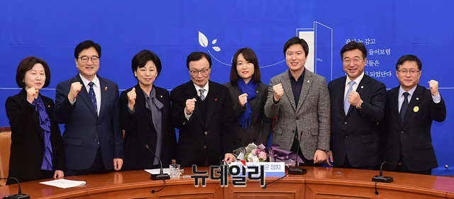 이해찬 더불어민주당 대표, 민주당 영입인재 8호로 임명된 이소영 환경전문 변호사 등 민주당 의원들이 14일 오전 국회에서 열린 민주당 인재 영입행사에서 기념촬영을 하고 있다.