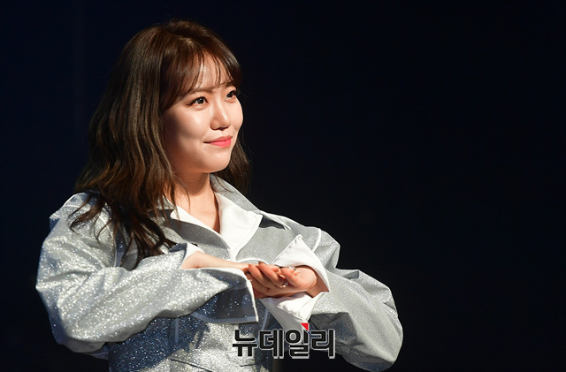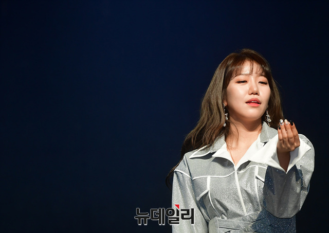 미스트롯 출신 김희진이 14일 오후 서울 마포구 하나투어브이홀에서 열린 데뷔 쇼케이스에서 포토타임을 갖고 있다.