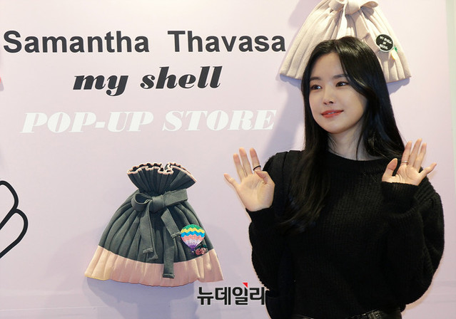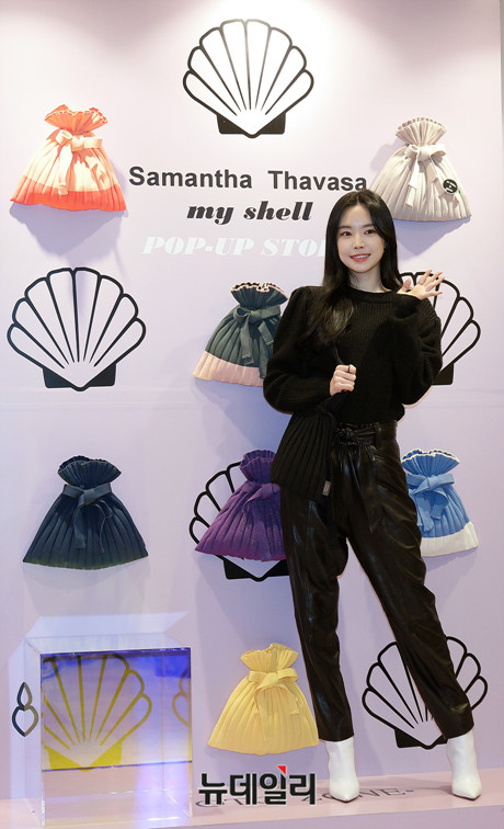 걸그룹 에이핑크 손나은이 14일 오후 서울 중구 롯데백화점 본점 사만사타바사 팝업스토어 매장에서 열린 '마이쉘(My Shell)' 백 출시 기념 행사에 참석해 포즈를 취하고 있다.