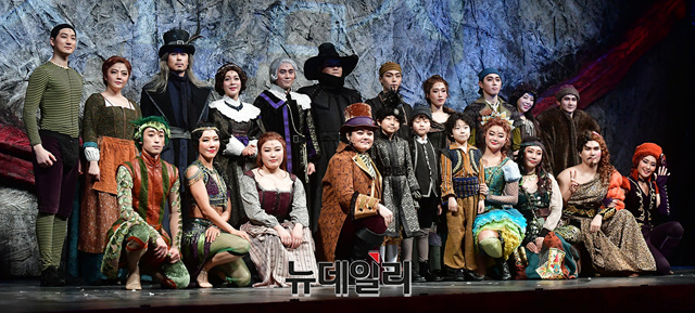웃는남자 앙상블이 14일 오후 서울 서초구 예술의전당에서 열린 뮤지컬 '웃는 남자' 프레스콜에서 기념촬영을 하고 있다.