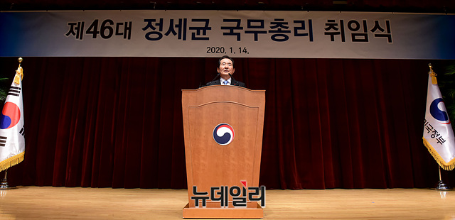 정세균 신임 국무총리가 14일 오후 서울 종로구 정부서울청사 별관에서 열린 '제46대 정세균 국무총리 취임식'에서 취임사를 하고 있다.