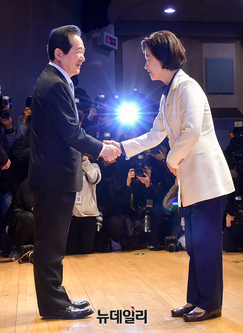 정세균 신임 국무총리가 14일 오후 서울 종로구 정부서울청사 별관에서 열린 '제46대 정세균 국무총리 취임식'에서 추미애 법무부장관과 악수를 하고 있다.