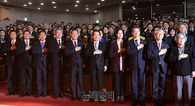 정세균 신임 국무총리, 국무위원과 참석자들이 14일 오후 서울 종로구 정부서울청사 별관에서 열린 '제46대 정세균 국무총리 취임식'에서 국민의례를 하고 있다.