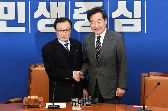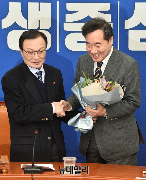 이해찬 더불어민주당 대표가 15일 오전 국회에서 열린 최고위원회의에서 당으로 공식 복귀한 이낙연 전 국무총리에게 환영 꽃다발을 전달한 뒤 기념촬영을 갖고 있다.