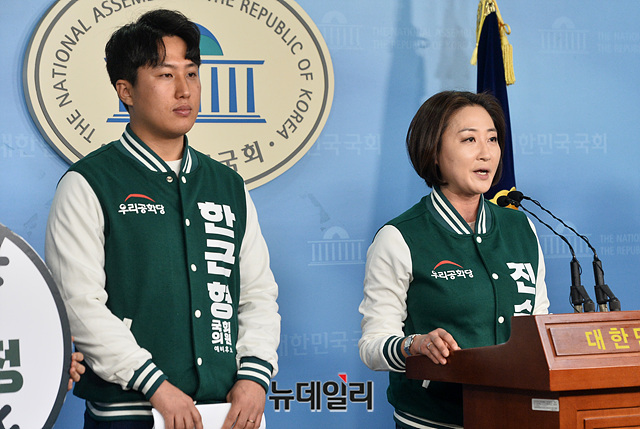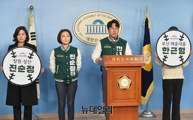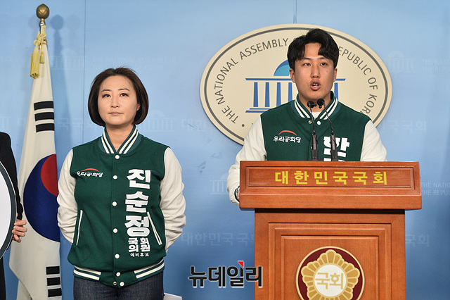 한근형 우리공화당 예비후보, 진순정 예비후보가 15일 오전 국회 정론관에서 '21대 총선 출마 기자회견'을 갖고 있다.